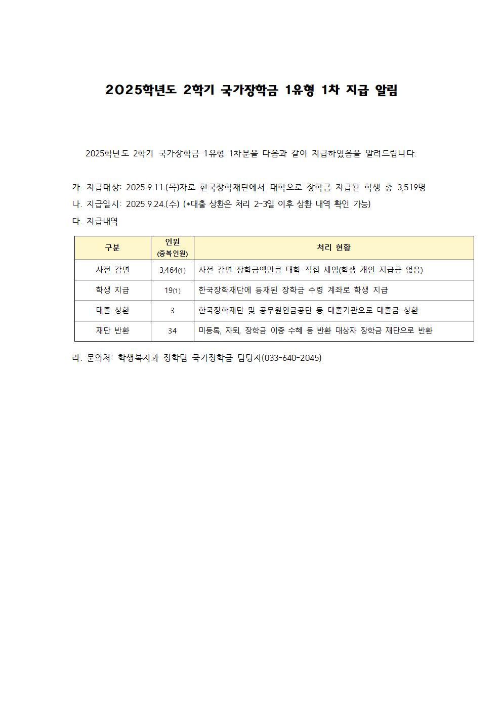 2025학년도 2학기 국가장학금 1유형 1차 지급 알림