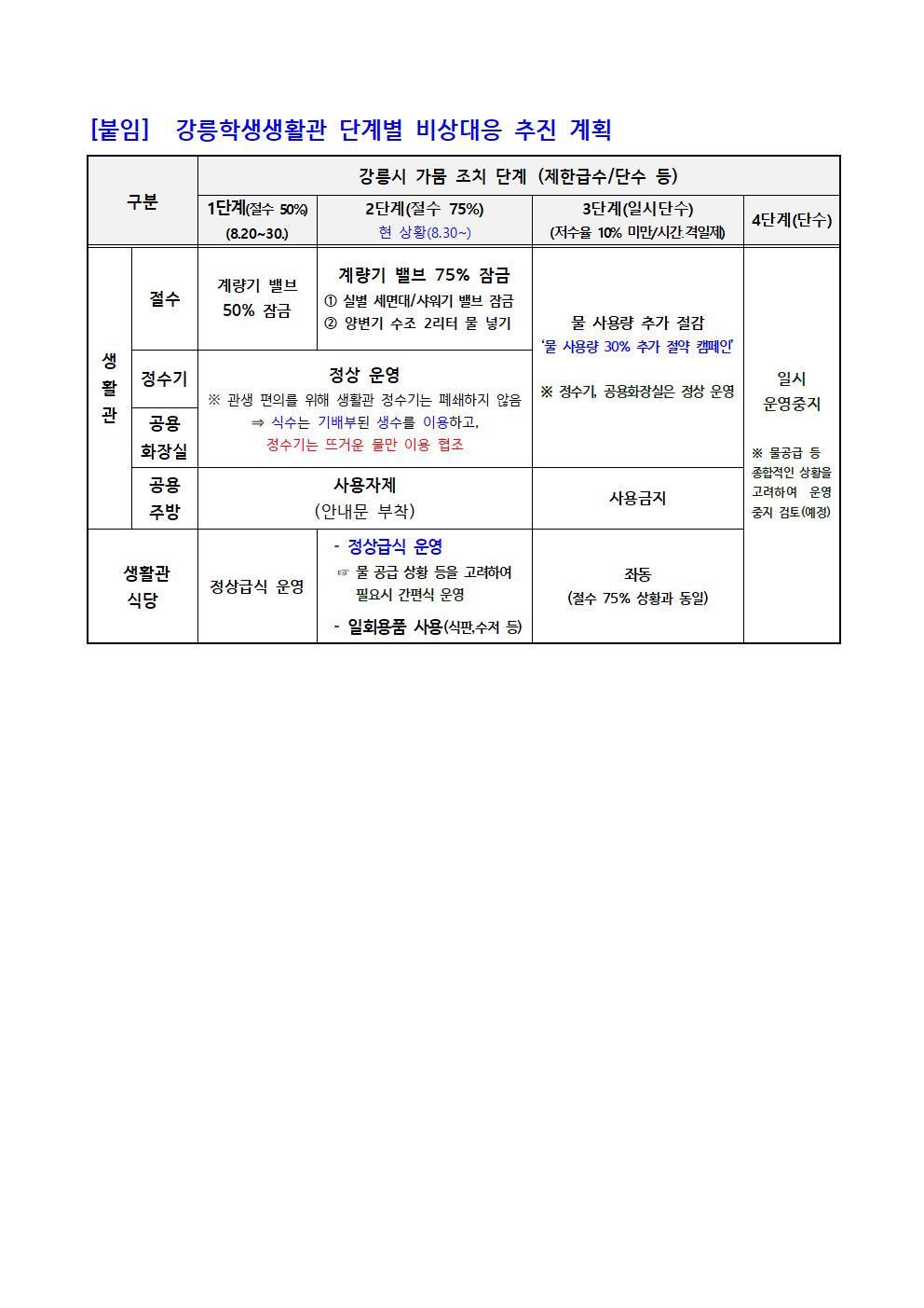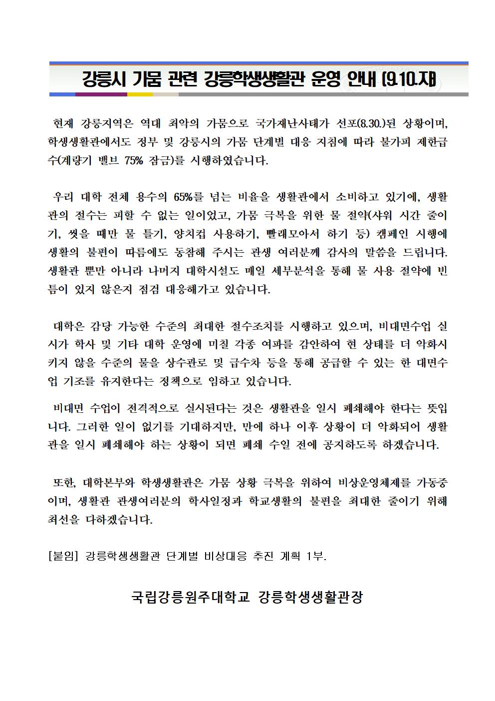 [생활관] 강릉시 가뭄관련 강릉학생생활관 운영 안내
