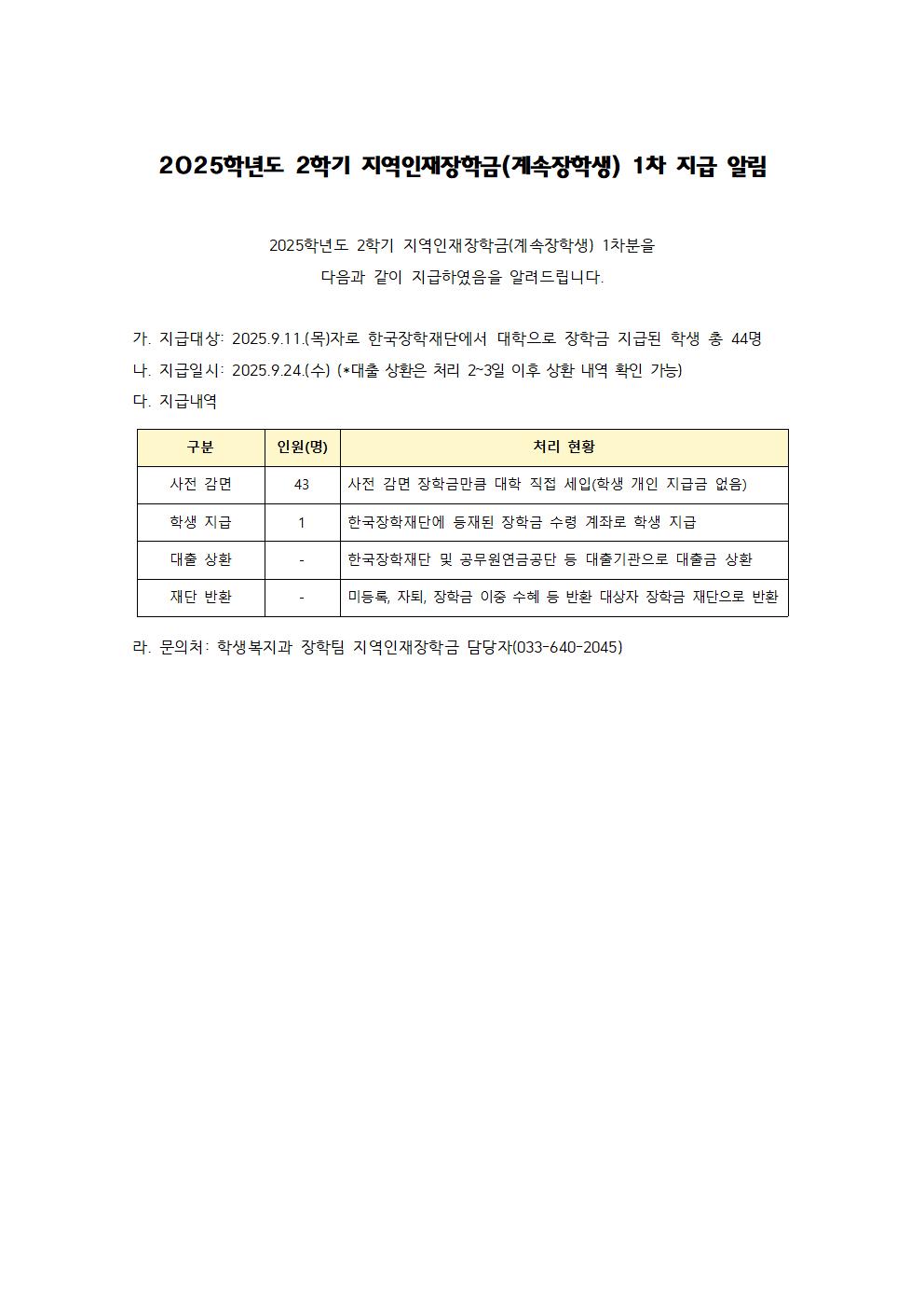 2025학년도 2학기 지역인재장학금(계속장학생) 1차 지급 알림