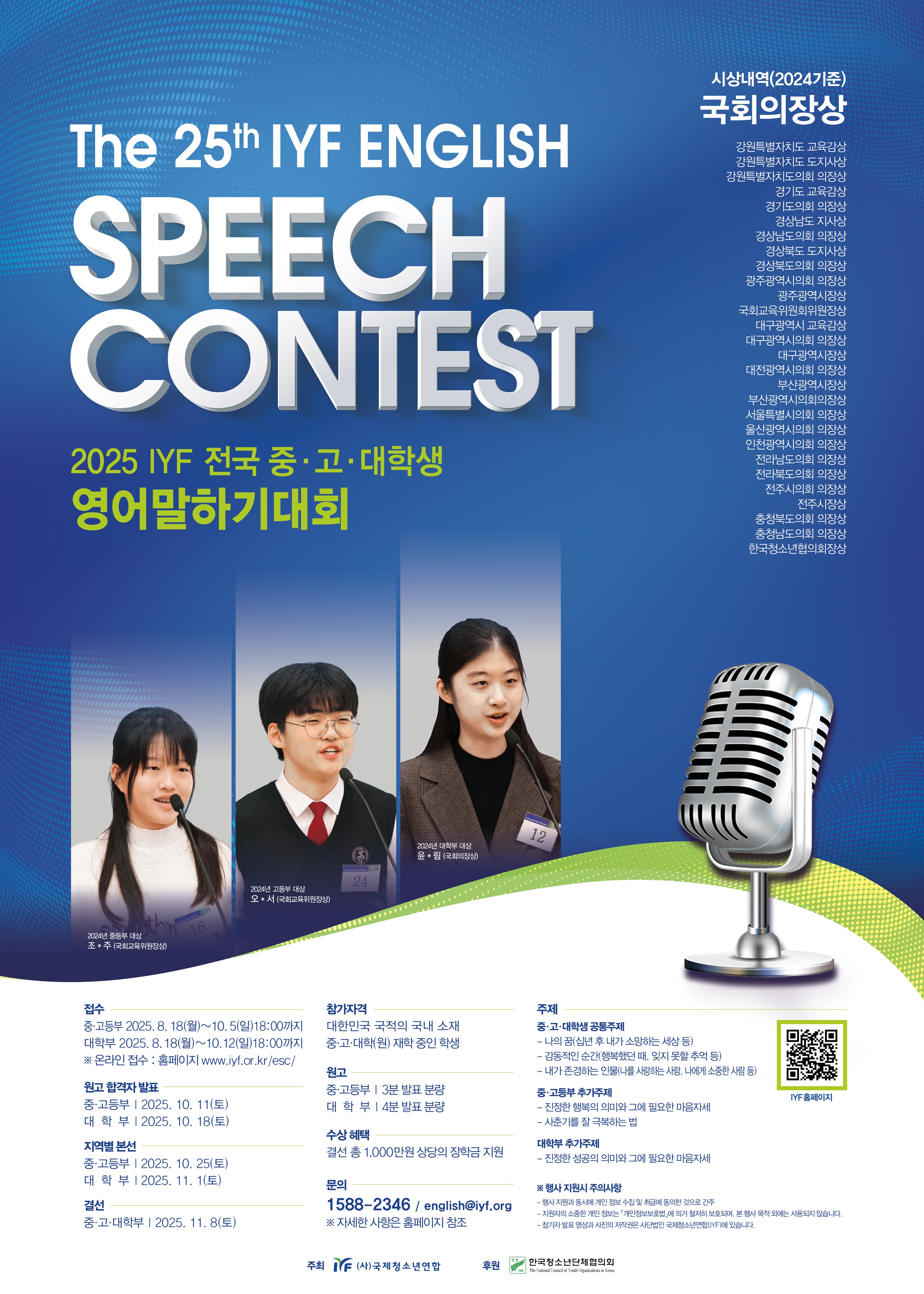 fnctId=bbs,fnctNo=1619 2025 IYF 영어말하기대회 홍보 알림 작성일 2025.09.18 작성자 학생복지과 직원 조회수 1701 첨부파일 2025 IYF 영어말하기대회 홍보요청의 건.pdf